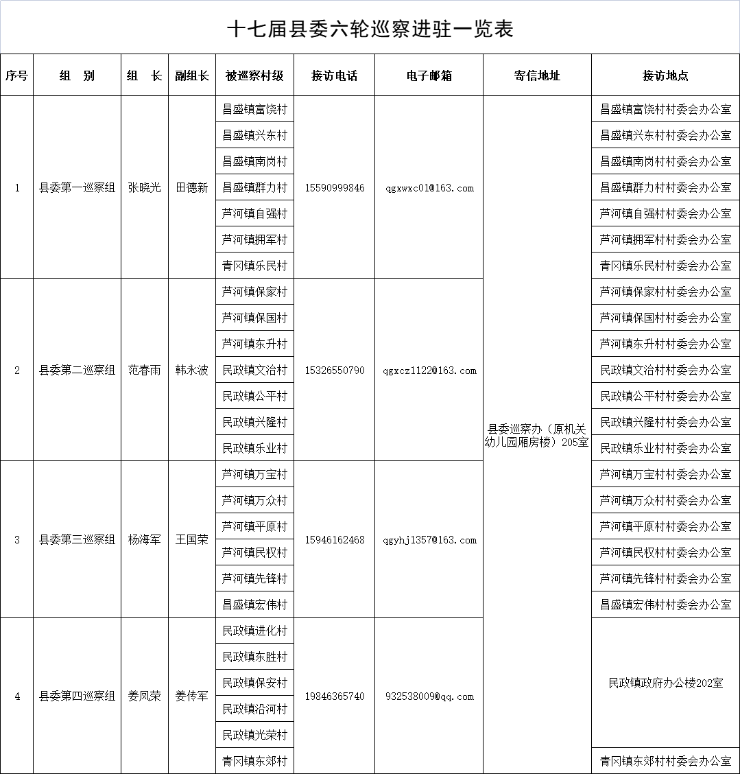 经县委批准,自2024年10月中旬至12月中旬,十七届县委第六轮巡察对芦河镇东升村、万宝村、万众村、平原村、民权村、先锋村、自强村、保家村、保国村,民政镇进化村、东胜村、保安村、沿河村、光荣村、公平村、兴隆村、文治村,昌盛镇富饶村、兴东村、南岗村、群力村21个村级党组织开展常规巡察,对青冈镇东郊村、青冈镇乐民村、芦河镇拥军村、民政镇乐业村、昌盛镇宏伟村开展巡察“回头看”。