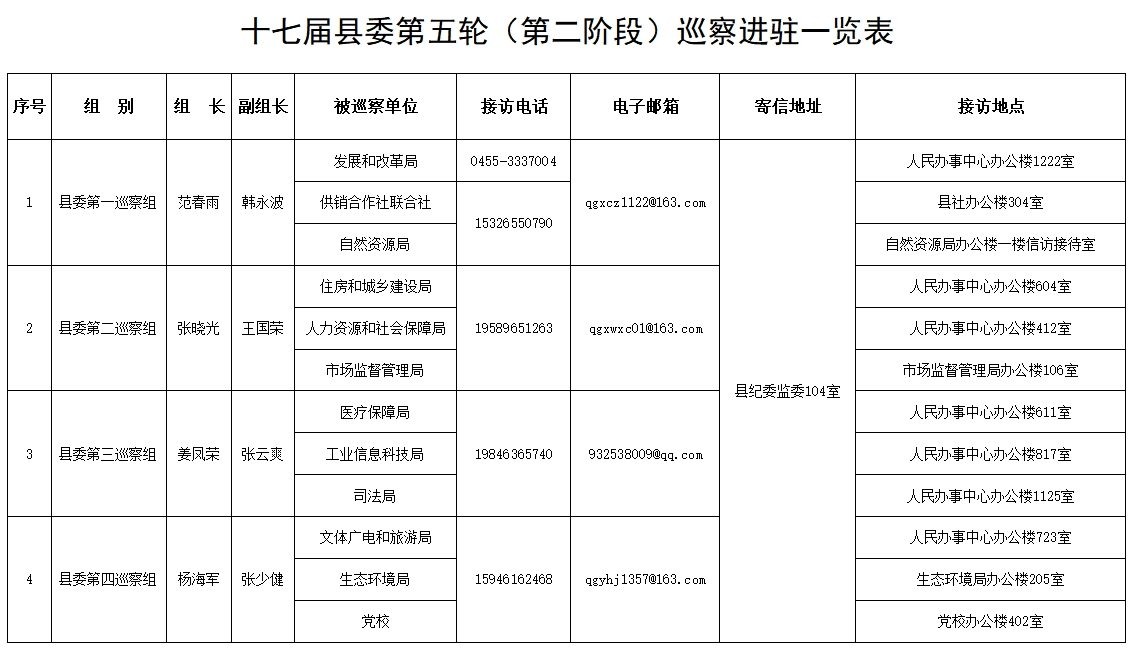 经县委批准,自2024年4月下旬至7月下旬,十七届县委第五轮(第二阶段)巡察,对县住房和城乡建设局、人力资源和社会保障局、自然资源局、生态环境局、医疗保障局、市场监督管理局、工业信息科技局、文体广电和旅游局、发展和改革局、司法局、供销合作社联合社、党校12家单位开展巡察。巡察期间,设立专门信访举报电话和信箱,主要受理反映被巡察单位党组织领导班子及其成员、下一级党组织领导班子主要负责人和重要岗位领导干部问题的来信来电来访,重点是关于违反政治纪律、组织纪律、廉洁纪律、群众纪律、工作纪律和生活纪律等方面的举报和反映。巡察组受理信访时间以巡察公告为准。